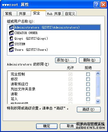 wwwroot目录的属性里有“安全”标签了,不过“组或用户名称”里没有IIS的用户。