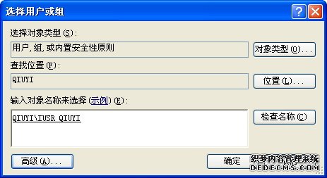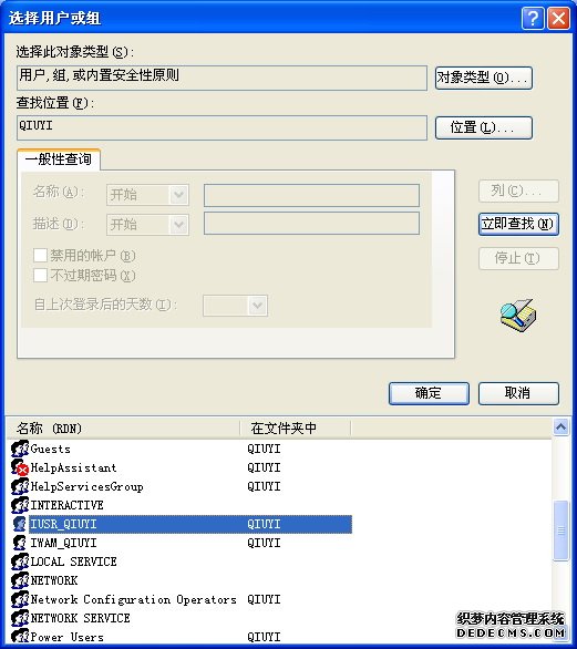 选择以“IUSR_”开头的用户名称,名称的后段是你的计算机名称(图中我的计算机名称是QIUYI),如IUSR_QIUYI。点击“确定”。