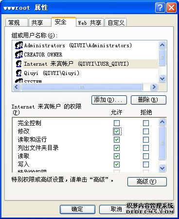 此时“组或用户名称”里有了“Internet 来宾帐户 (QIUYI\IUSR_QIUYI)”,红色部分为你的计算机名称。选中“Internet 来宾帐户 (QIUYI\IUSR_QIUYI)”,在下面的权限设置里的“允许”项选中“修改”,“确定”完成。
