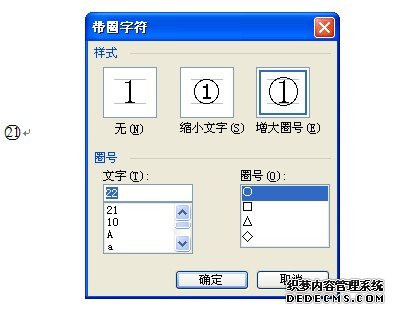 (1)选择样式。在"样式"选择框中有3个选项;"增大圆圈"是为了让圆圈扩大,以便将文字全部圈在里面,选择圆圈。